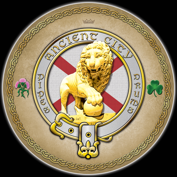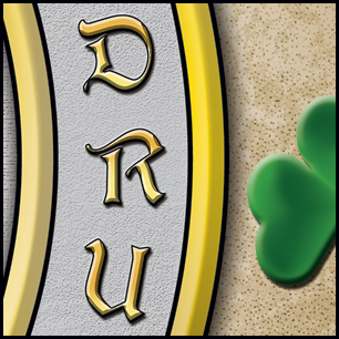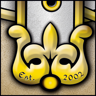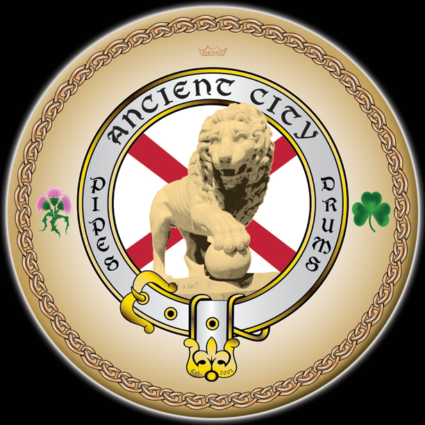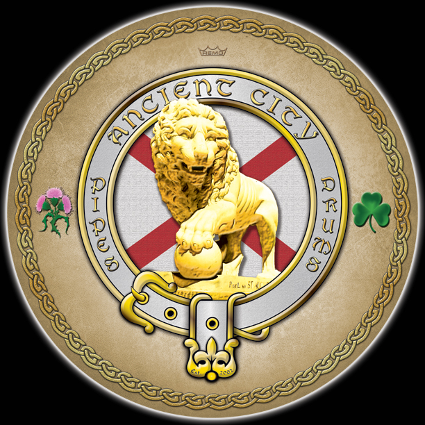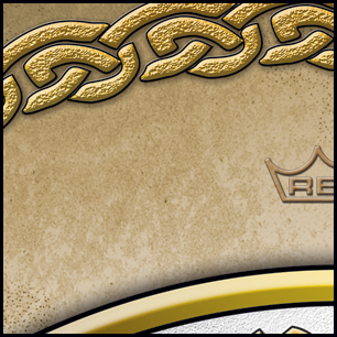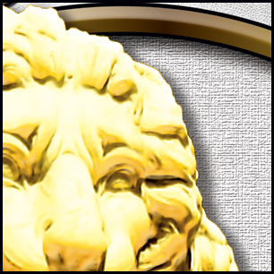 |  | Here's your design with finishing effects. We went with an authentic calfskin texture for the background. The statues have been changed to gold. The flag has a woven texture, and the belt has a slight leather-grain. All the metallic elements are smooth, with subdued highlights, except the outer knotwork, which has a grainy texture. The "EST." type appears to be carved into the buckle.The previous version is at the bottom. |  |