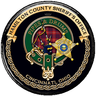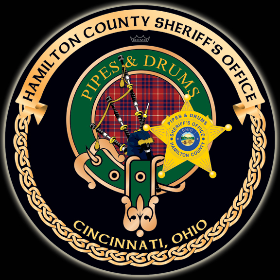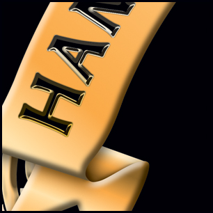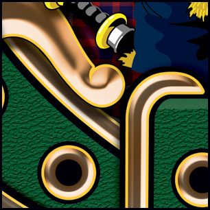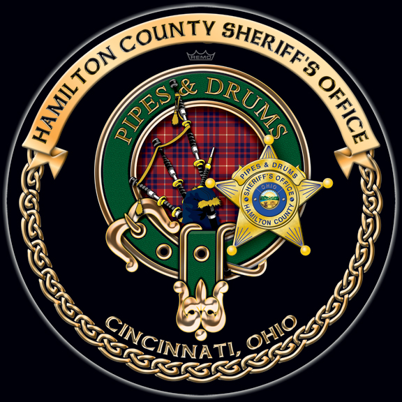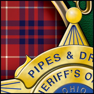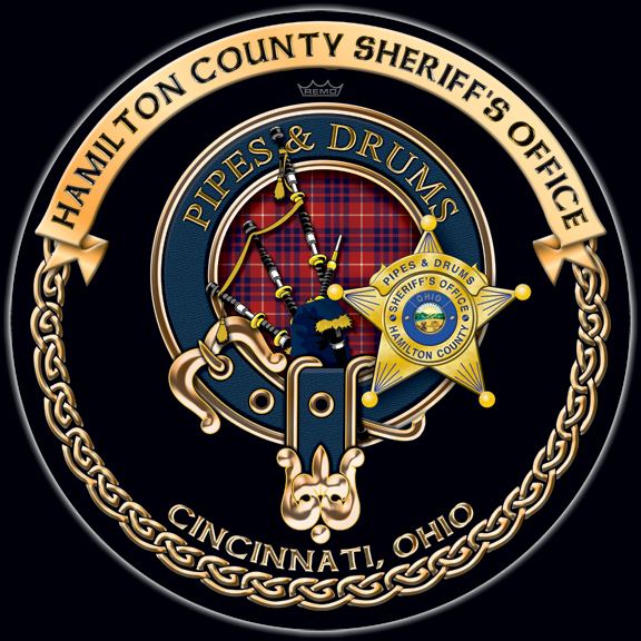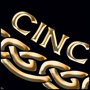 |  | Here's your design with finishing. In the closeups you can see how the many elements have been blended together. The type on the banner at top has been made a dark, shiny metal. The badge is a brighter gold, with warm highlights and a slight discolorations. The tartan is shadowed to appear behind the textured belt, which is trimmed in a highly polished metal. This polish is also apparent in the belt elements. The outer Celtic ring, "Cincinnati", and "Pipes" have a similar threatment. The pipes are placed to hang out over the tartan background and the belt buckle. We left the mouthpiece peeking out from behind the lower strap. A bit further down you'll see a larger version and a version with a blue belt. They both look great. At the very bottom we've left an earlier version. |  |