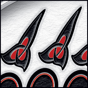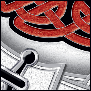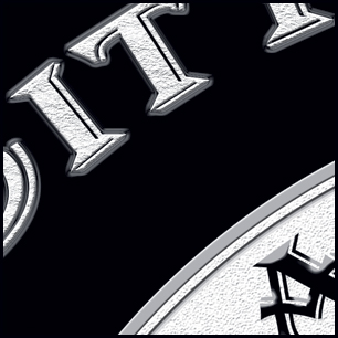 Here's your design with finishing effects, and some cloeups that show some details. Generally, the changes will be very subtle when viewed at a distance, but as one gets closer the details will become stronger. In the closeups you can see the snow texture, with a slight indentation where the paw has been pressed into it, and the snow element appears in the paw elements where it didn't adversely effect the graphic. The belt is a white leather, and the clasp now has a polished, metallic look. The outer type has an emboss, and a variation of the snow texture. An earlier version is posted at the bottom. | ||