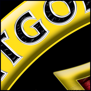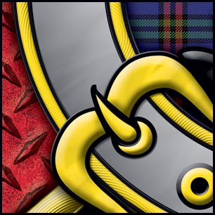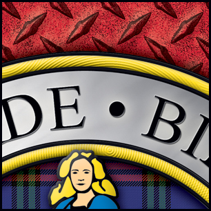 Here's your design with finishing effects, including some closeups to highlight some details. The outer yellow ring now has developed type, embossing and shadowing. The maltese now has the red metalplate, and a gold leaf texture on the gold elements. The belt has subtle metallic texturing. The tartan is brighter, and has a fabric texture. The woman has a slight emboss and dropshadow. The earlier post is at the bottom. | ||
