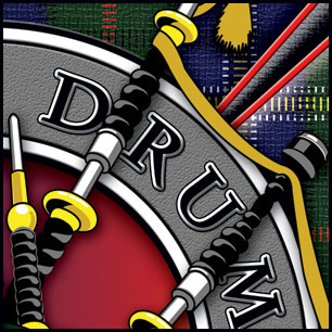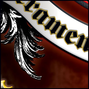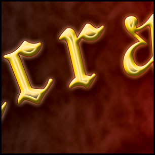Here's finishing work on your design. The red background has a texture that resembles smoldering fumes. The outside type is now in a 3D gold with highlights, with a dark red outline and a soft yellow-orange glow to maintain clarity. The central logo is lifted off the background, while embossing, shadowing and textures are blended in where appropriate. Very nice! The earlier, basic artwork is posted at the bottom. | ||
