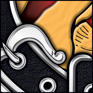Here's your design with finishing effects, and some closeups for detail. We tried filling out the outer lettering with a red accent similar in shade to the tartan red. We looked at the flames, but they do make the lower type very difficult to read. All the silver elements have been given a shiny, embossed metallic treatment; including the axe blade and the trim around the banner. Textures have been added to the belt, lion, and banner. Drop shadows have been added for depth, and to define each element's placement over what's behind it. The earlier version is posted at the bottom. | ||