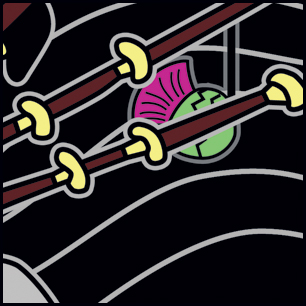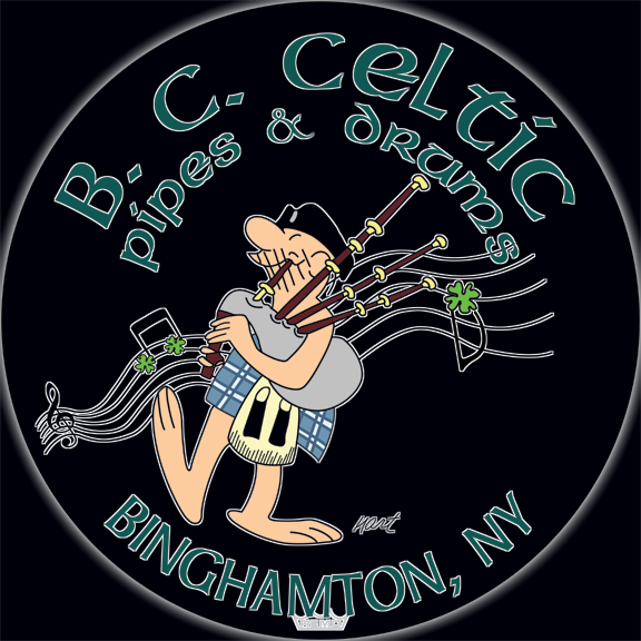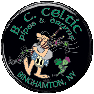 Here's our final. We went with a softer gray for much of the outlining; the white was too loud and distracting. The close-ups show the lettering, and an area of alot of congestion...the image maintains clarity even in this difficult region. The thistles are very accurate to the original. The signature is now in white. The Remo crown is screened back. The previous image is at the very bottom. | ||