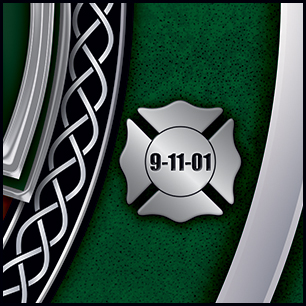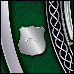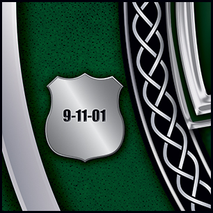 Here's a new post with the change to black for the "9-11" type. The closeups provide a great view. We've kept the engraving, and added a slight glow to enhance the contrast. Here's your design with finishing effects, and a couple of closeups for detail. The outer type is now an embossed gold, with a very slight greenish outline for greater definition. The gold in the cross design is similar, but without this outline. All the grey areas have been given an embossed, silver metallic look. This includes the police and fire badges, where the "9/11" numbers have been engraved. Drop shadows have been added where appropriate. The earlier post is included at the bottom. | ||