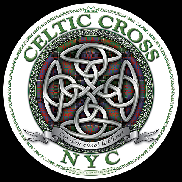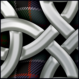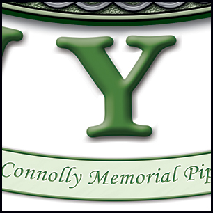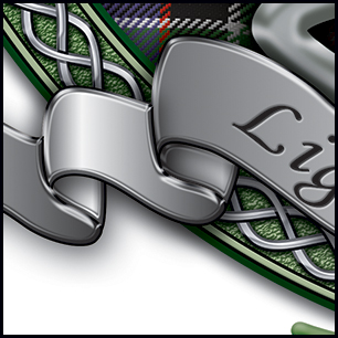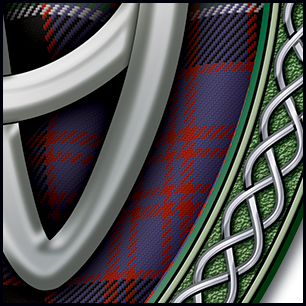 Here's your design with finishing effects, and a couple of detail closeups. The central cross is now embossed, rounded in a shiny metal with a slight green tinge. The tartan, acting as a bed for the cross, shows folds that follow the shapes in the knotwork. The silver knotwork ring is placed in a green encrusted setting. The banner has bright, sharp-cut border and engraved lettering. The "Connolly" plate is integrated into the outer green ring, on a light green background with raised type. The earlier version is at the bottom. | ||