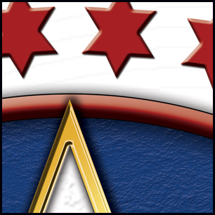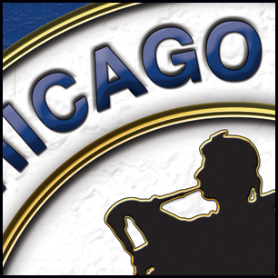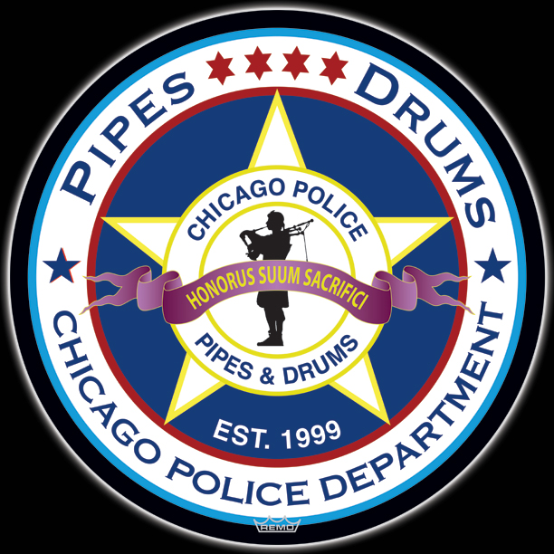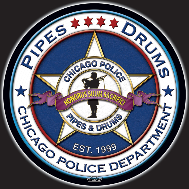Here's your design with finishing effects, along with some closeups for detail. Subtle textures have been added in the blue background, banner, and the white portions of the design. Lettering has been embossed, and gold sections have been given a metallic look. We added a bevel on the piper, and made it to look like a gold inlay. The earlier version is at the bottom of the page. | ||