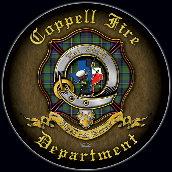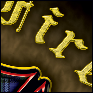 Here's your design with finishing effects. The closeups show the gold leaf outer lettering, brushed silver belt, and stressed banner. We changed the "Pipes And Drums" to a silver, to be more continuous with the belt colors.