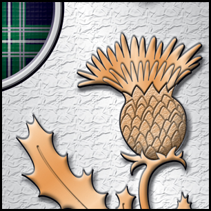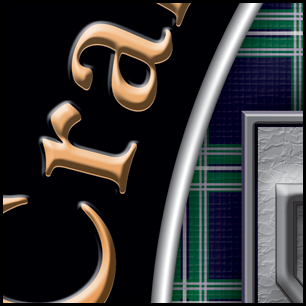 Here's the advanced version of your file. We like the textured metal, especially as it lends a nice contrast with the polished surfaces. The thistle has texturing on the bulb to help the petals blend together, but the rest is in a smooth polished metal. The cross design is striking; but we want to shine up the thistle a bit before we go to print. The tartan now has a faux weave added, and the gold lettering has a slight backlight for effect. | ||