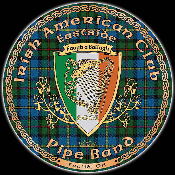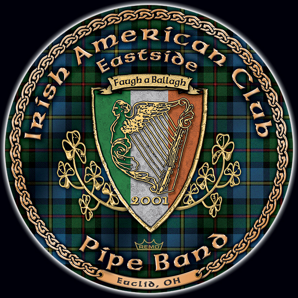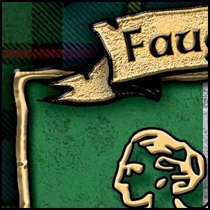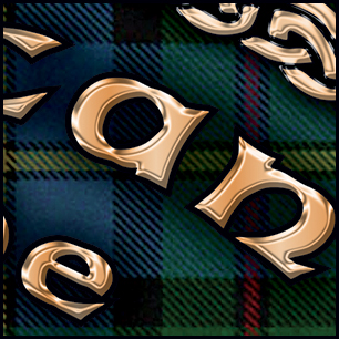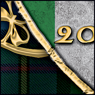 Here's your design with finishing effects, along with a couple of closeups. Aside from the many metallic effects and drop shadows, there's a couple of other aspects worthy of note. The Irish flag has a rough texture that indicates some wear and tear, which also serves to mute the colors. This allows the harp to stand out; the harp's drop shadow is exaggerated to lift it further off the background. The badge's gold trim, and the top banner also have stressed textures, but the harp and clover have remained smooth. The delicate shapes of these two elements do not hold a stress texture well, and the smoothness maintains their elegant contours. The tartan background now exhibits random shadows and highlights. The previous, unfinished version is posted at the bottom. | ||
