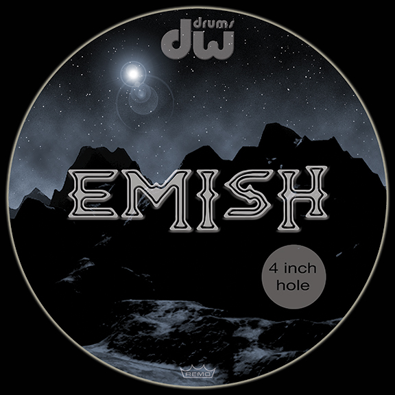 Here's a layout for your drumhead. Your logo is perfectly centered in the head without disturbing the line of the mountain range. The DW and Remo logos are partially transparent to blend in with scene. The mic hole is placed in an entirely black area of the scene. | ||