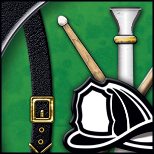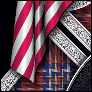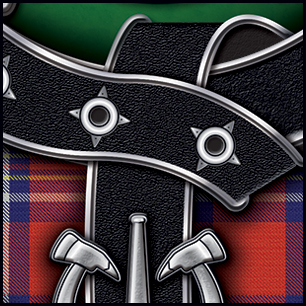 Here's your design with finishing effects, and some closeups for detail. The outer lettering is now a warm gold, with s soft backlight to create depth. The maltese trim, and other elements are now a smooth shiny silver, with the scrollwork embossed into the trim. The belt and straps have a leather texture, and the pipes have a very slight rough texture. The buckles, strap buckles and the bugle show slight signs of age or wear, and the green central background has some corrosion. The drumsticks have a wood grain overlay. Shadows and other effects have been applied where appropriate. The earlier post is at the bottom. | ||