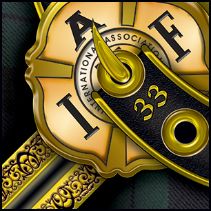Here's your design with finishing effects. The outer type is now a shiny, smooth gold, with a brighter red outline. The large banner has metallic, embossed edges, with a slightly raised type. The belt has an arched, leather texture, with all the fittings done in brass. The center scamble rests on a brushed background, and a gold edge-stripe has been added to the letters. There is a very subtle drop shadow on the letters which lifts the them off the background. The tartan now has folds, with appropriate shadows and highlights. Other 3d effects have been added where appropriate. The pre-finishing version is posted at the bottom. | ||