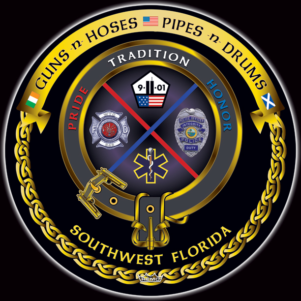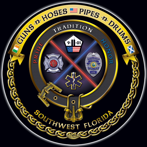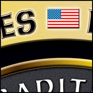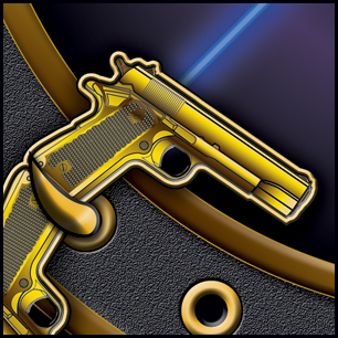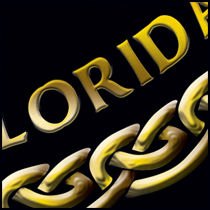 Here's your design with finishing effects, along with some closeups for detail. The crossed red and blue stripes now have a neon glow. The banner has a slight texture, with raised letters and flags. The belt has a soft leather texture, which makes the gun and hose buckles stand out. The outer knotwork has a 3D rough look. All other elements have bevels and dropshadows. The entire design is bathed in a dramatic yellow-metallic light. The earlier post is at the bottom of the page. | ||