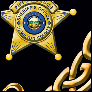 Here's your design with finishing effects, along with closeups. All the items that were not changed in this new version retain their original finishing effects. We noticed a font error in the previous mockup. Somehow the font in the banner was changed to "Windlass", which has jagged contours, and didn't look good in the finishing stage. We reverted back to your previous header font. The closeups include both badges; the police badge came out great! The Sheriff's badge looks the same as the original after even after being scaled down. The previous mockup is posted at the bottom. | ||