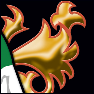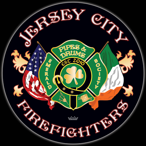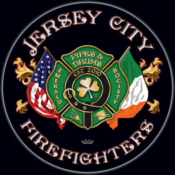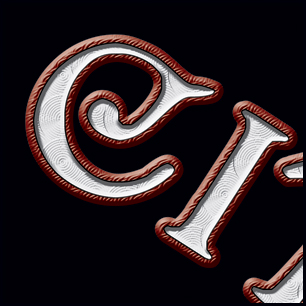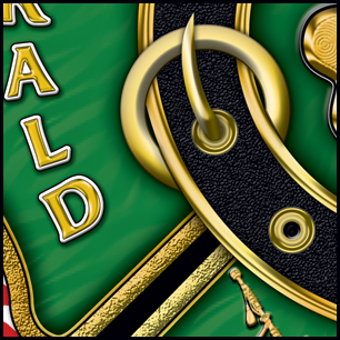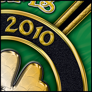 Here's your design with finishing effects. We discovered that the "Jersey City" font has a hand-drawn character in its detail, meaning that the contours have slight variations. In the closeup you'll see what effects we've used to help the letters appear smoother. The white-leaf has a nice effect. In the other closeups you can see the coarse texture on the maltese gold edging, and the smooth, more polished effects on the type. The shamrock is very shiny and has a gold-leaf texture. The belt buckle is a softer gold, and appears to pass behind the belt. The flourish on the sides of the design have a smooth gold look, with an emboss that gives an illusion of depth and shape. The earlier version is posted at the bottom of the page. | ||