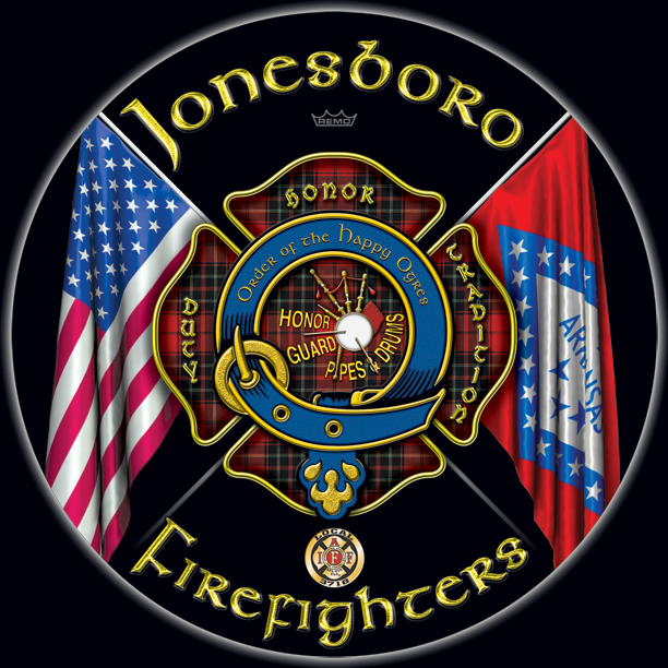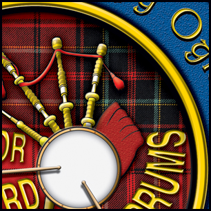 Here's your design with finishing touches, and some closeups to see the details. We kept the flagpoles in, but faded them before the bottom type...it seemed to work the best. Everything else has been carefully blended together. I particularly like the shadows on the drumsticks! | ||