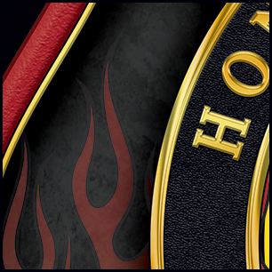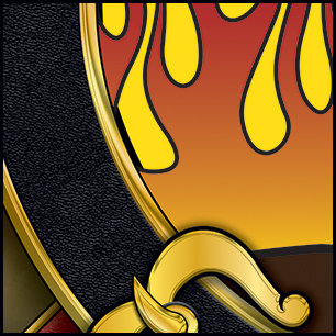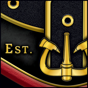 Here's your design with finishing effects, and a couple of closeups for detail. There are two versions; one with textured maltese petals, and the second with some flames borrowed from the "Bear" graphic, screened back a bit. Overall, the gold elements have been finished in smooth, shiny metal. The outer lettering has a double-emboss that gives the letters a 3D appearance. The belt has a leather texture, the maltese petals have a subtle texture, and the red maltese border looks like powder-coated metal. Shadows, bevels, etc. have been added where appropriate. The "Bear" graphic has been left as-is. As we started to explore options for this element, we felt that it changed the character of the design too much...as the unique identifier of your group, it should retain it's original character. The earlier mockup is posted below. | ||