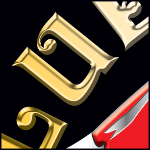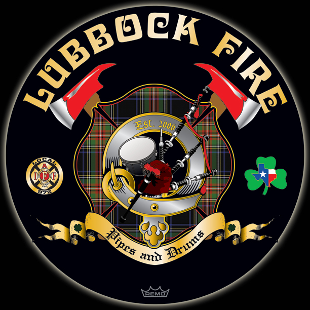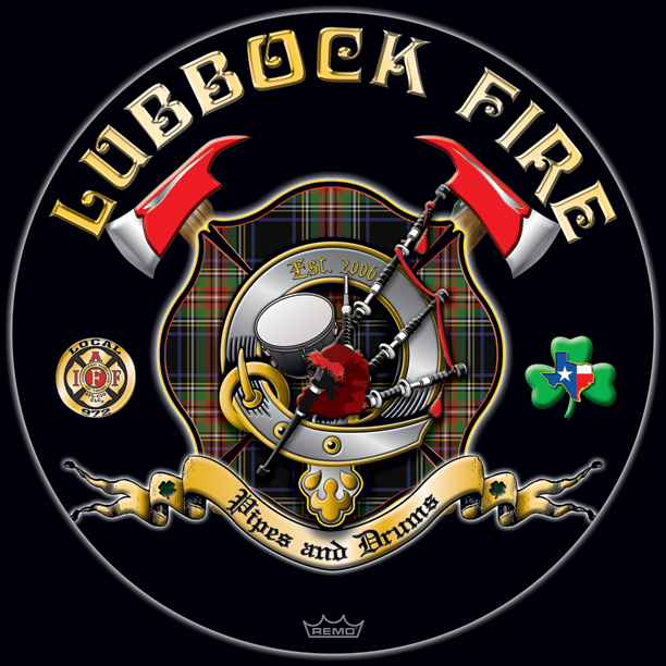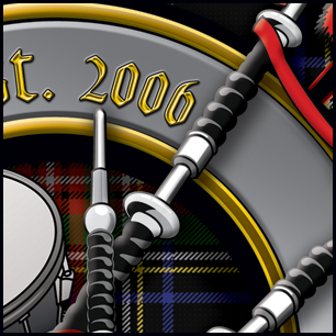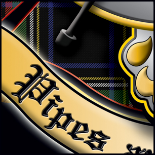Here's your design with finishing effects, and some closeups to show the interplay of the various elements. We've allowed the tartan to show through behind the belt, which allows for drop shadows from the instruments placed in front of it. The earlier version is posted at the bottom of the page. | ||