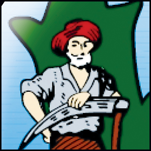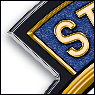 Here's your design with finishing effects, and a couple of closeups for detail. We've added metallic emboss and shadowing wherever appropriate. The silver border and slight drop shadow frame the main design nicely. We added a gold piping along the border of the blue areas, which now have a slight texture. The lighting on the central element gives it a rounded, button-like appearance. This element has been softened a bit to smooth the rough edges, only to a point where the image remained fairly sharp. Scroll down to see the design on a black background, and the earlier version is posted at the very bottom. | ||