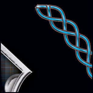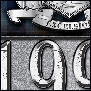 Here's your design with finishing effects, along with some closeups for detail. The lettering effects are exactly the same as the Henderson lettering. The badge elements are shiny, aged metal that show signs of wear. The center icon is embossed, but not so stressed, as we didn't want to disturb the detail. The knotwork has been embossed, and the brown outlines have been given a leather texture, even though it's hard to see at this small size. The earlier post is at the bottom of the page. | ||