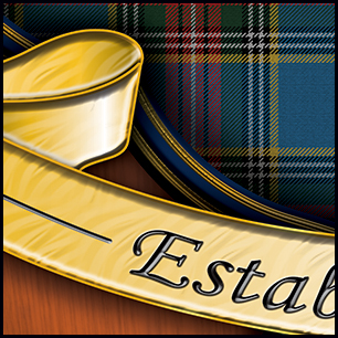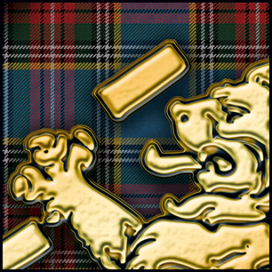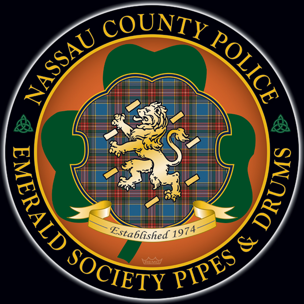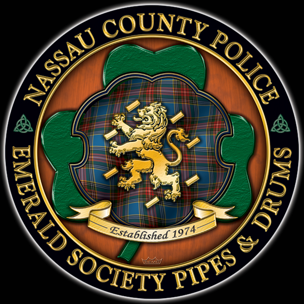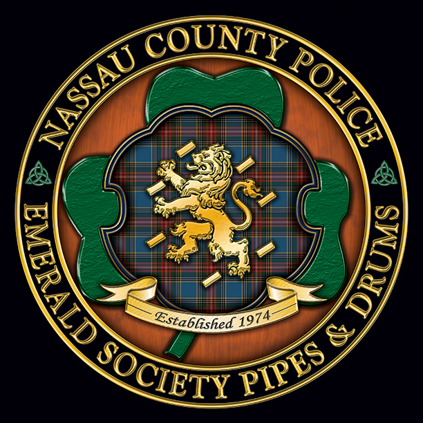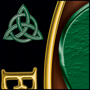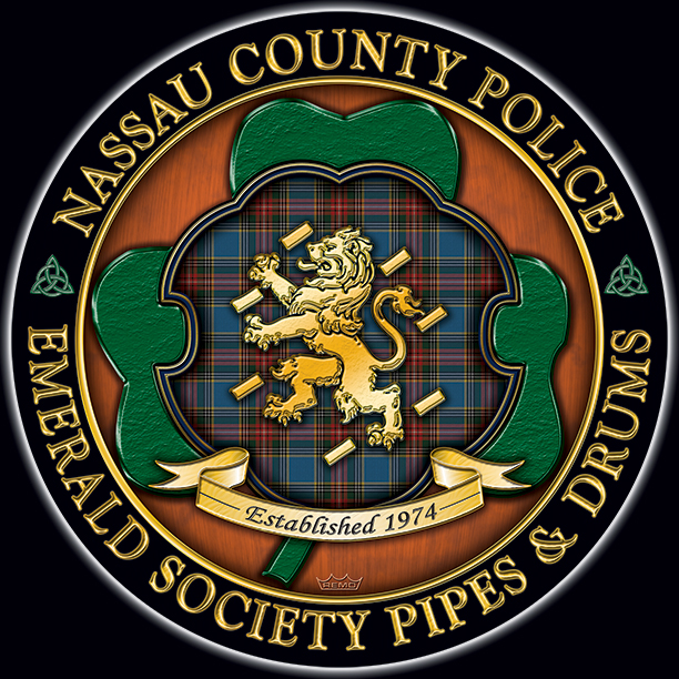 ADD: The new top image has a flowing tartan; everything else is unchanged. Here's your design with finishing effects, along with some closeups for detail. The first image is of the logo to be used for all things; with the outer ring. The second image is what the drumhead will look like without the outer ring. The orange background is warmed-up with a striated texture that looks somewhat wooden, and the beveled shamrock lies over it, with a subtle rough texture. The tartan-shield is embedded into the shamrock setting. We left the trim in the police blue, accented with gold edging. The tartan is clear and formal. The lion, banner and outer letters are in a similar soft gold. The knotwork, although small, is a complex element that came off beautifully. The earlier post is at the bottom. | ||