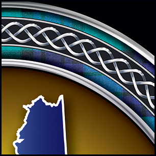Here's your design with the finishing effects, and a couple of closeups for detail. All the grey elements have been given a metallic look, as well as embossing and drop shadows where appropriate. The state map also casts a slight drop shadow. The tartan has been brightened and enriched to have a stronger presence, which helps compensate for its limited exposure. The flags have been brightened as well. The earlier version is posted at the bottom. | ||
