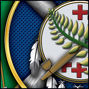 Here's your design with finishing effects, along with a few closeups, and a view of the logo without flames. The maltese and axe handles now have a woodgrain texture, including the white handles that cross the center. The maltese has an outer glow from the fire. The green maltese has a subtle stress texture, and the pipes and drum elements have been embossed and shadowed. The central elements also have embooss and shadow and we've added gold trim rings. The white banners have a painted wooden appearance with sunken letters. The closeups show the flames that envelop the edges of the design. The earlier mockups are posted below. | ||