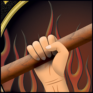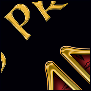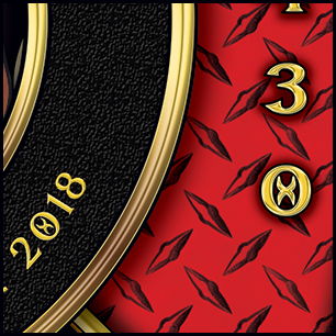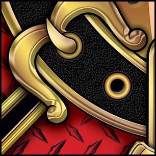 Here's your design with finishing effects, along with some closeups for detail. All the lettering, belt hardware and maltese trim have been finished in a warm gold. The maltese has the metalplate pattern, and the "IAFF" lettering has just enough dropshadow to keep it easy to read against the metal texture. The axe handle has a woodgrain, and the hand grip has been refined. The flames in the background have a subtle emboss. The earlier mockup is posted at the bottom. | ||