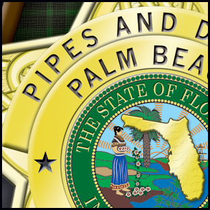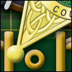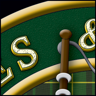 Here's your design with finishing effects. The mockup shows what the head will look like when viewed at a distance. All the elements are clear and easy to read...nicely balanced. The closeups show some of the design's details. The outer type is textured and beveled, with a subtle carved inlay. The belt has a rough texture and the tartan now has a weave. The badge has multiple bevels and textures. The pre-finishing version is at the bottom. | ||