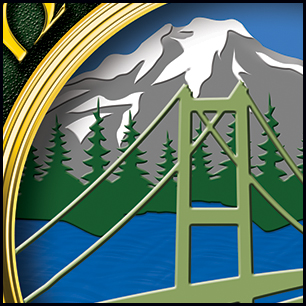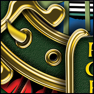 Here's your design with finishing effects, and several closeups for detail. The outer type has a pseudo-metallic-neon-backlit treatment. The maltese has a slightly red body with a leathery texture; if the body remained black, it would appear hollow because the overall head is black. The central scene has subtle embossments, the lake has slight waves and cross-currents, and the bridge and tail end of the boat appear in foreground to the landscape. All yellow elements have been given a dramatic shiny metal look, and the overlap of elements around the belt buckle area came off really well. The lower banner is in a more antique color, including a slight patina and engraved lettering. The earlier version is at the bottom. | ||