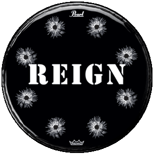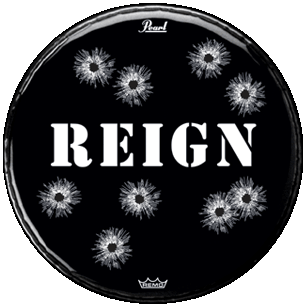 Here's a couple of drumheads we've shot up. One is a symmetrical pattern, the other more random. The Pearl and Remo logos are at the regulation 2" size.