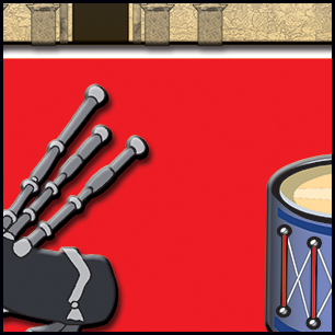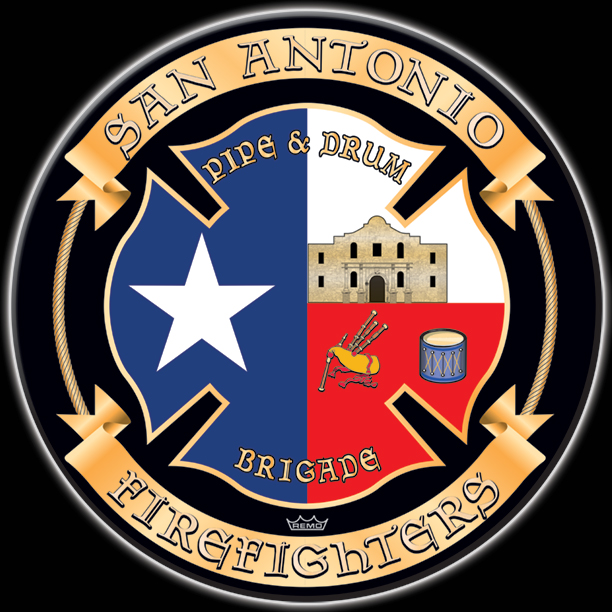 Here's your design with finishing effects, and several closeups for detail. The outer type is slightly more refined, and the outer banners have a new border and drop shadow added. The Alamo has been scaled slightly, embossed and given a small drop shadow. The maltese border is more metallic, and the maltese body has a slight downward emboss. The pipes have been changed to a more neutral color, and the drum now has red and white detail, which relate to the Texas flag colors. Both instruments have drop shadows. Metallic highlights have been added to the maltese typs. The unfinished version is posted at the bottom. | ||