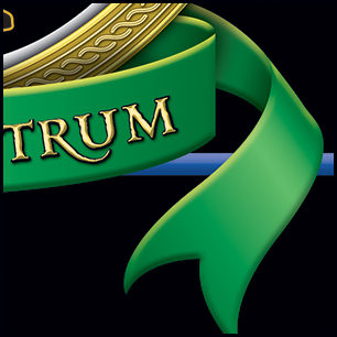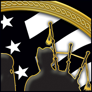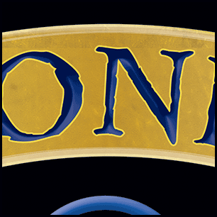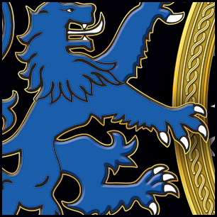 Here's your design with finishing effects, along with a few closeups for detail. The outer ring is now textured and embossed, with the lettering carved into it. The lettering has a bright outline to enhance the contours of the letters. Almost all of the other elements, (lions, center gold ring and figures, banner sections, etc.) have some level of embossing as well. We've added a thin gold outline to the lions to make them stand out, which also fits stylistically with the center silhouettes. The figures also have a dropshadow to lift them off the flag background. We moved the banner up so the gold ring rests behind it a bit. Appropriate drop shadows have been applied. The previous mockup is posted at the bottom. | ||
