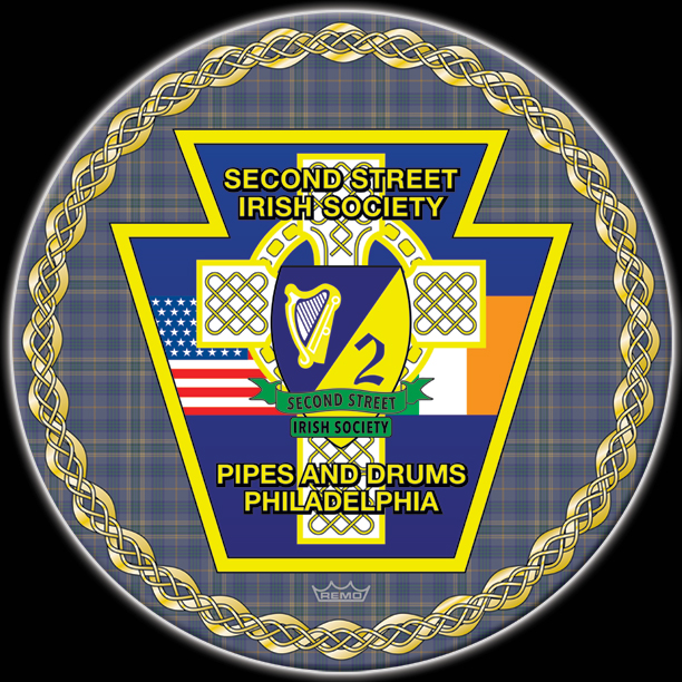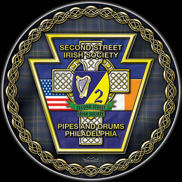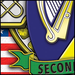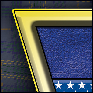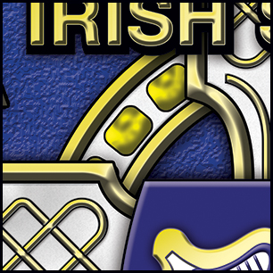Here's your dersign with finishing effects, and some closeups for detail. The outside knots are in a darker gold with a hand-tooled look on the upper knot design. The tartan has a dramatic "flowing" effect and shadowing. The blue field has a slight rough texture which, to a lesser degree, is applied to the flags. The cross has a gold metal effect, with a jeweled appearance added to the elements in the ring behind the cross. The cross itself has a very slight texture, and some light discolorations. The green banners have a thin gold edge. The two-color shield lays over the cross, in a smooth texture. The harp and "2" are embossed. The previous post is at the bottom. | ||
