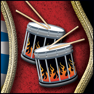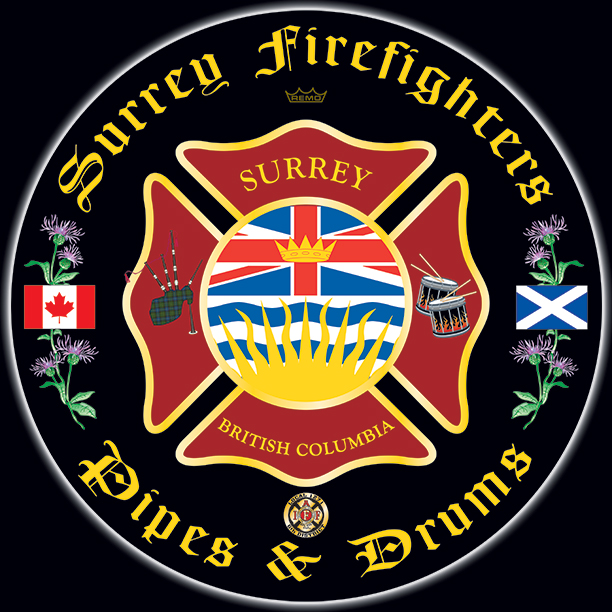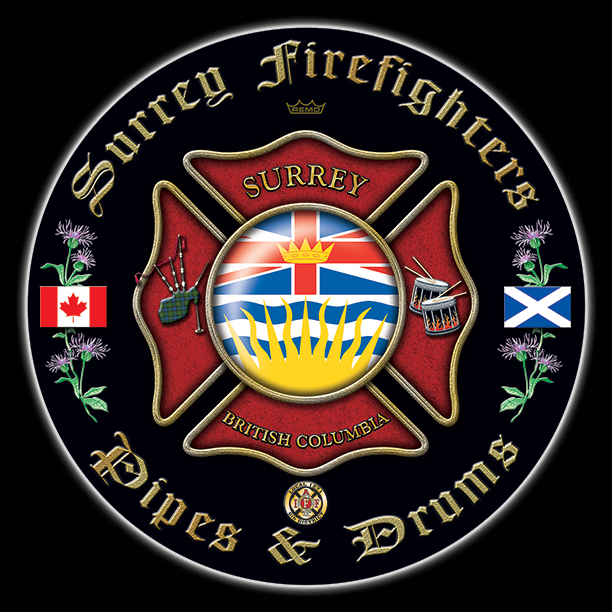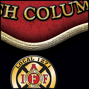 Here's your design with finishing effects, and some closeups for detail. The center flag has been made to look like it's under a diffused glass. The gold lettering and maltese trim are now in a rough gold, and the maltese petals have a weathered texture. The pipes and drums have been embossed, with the tassel of the bagpipes casting a great shadow on the maltese trim. All the letters, and the IAFF logo, have been given depth behind their gold inlay. The maltese trim has a center spine that runs throughout. The earlier mockup is posted at the bottom. | ||