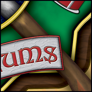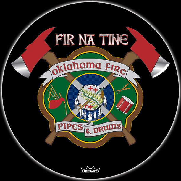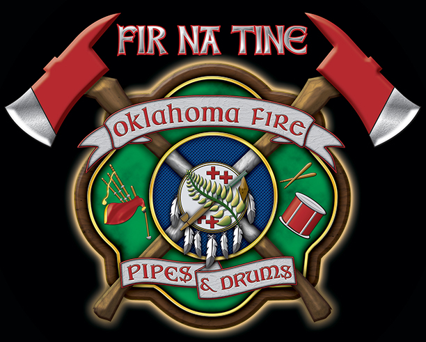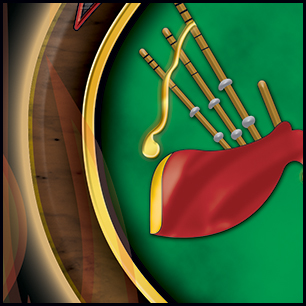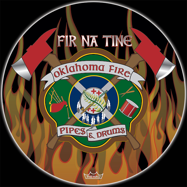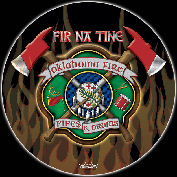 Here's your design with finishing effects, along with a few closeups, and a view of the logo without flames. The maltese and axe handles now have a woodgrain texture, including the white handles that cross the center. The maltese has an outer glow from the fire. The green maltese has a subtle stress texture, and the pipes and drum elements have been embossed and shadowed. The central elements also have embooss and shadow and we've added gold trim rings. The white banners have a painted wooden appearance with sunken letters. The closeups show the flames that envelop the edges of the design. The earlier mockups are posted below. | ||