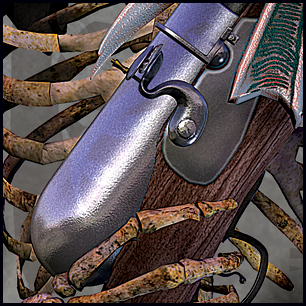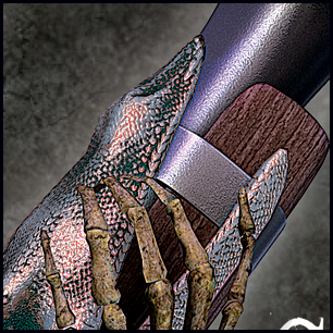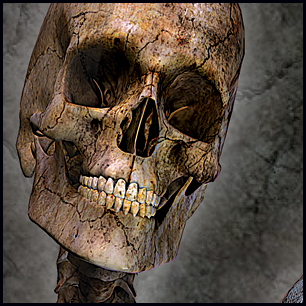 Here's the minor adjustments we've made. The logo is now in chrome, an improvement over the white version, and the "Ultimate" type is taller, with a slight drop shadow and slight orange overtones. The smoke has been added, drifting behind and along the barrel. We like it! Minor adjustments have been made to lighting, color...also fixed the left arm bone position. Earlier post is toward the bottom. | ||