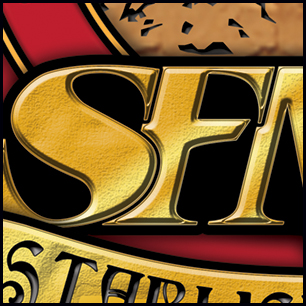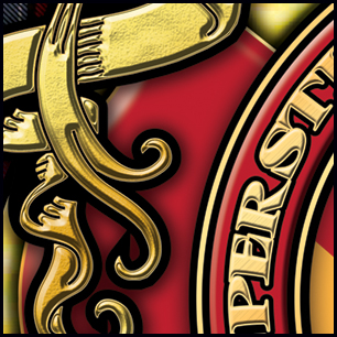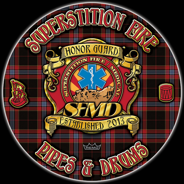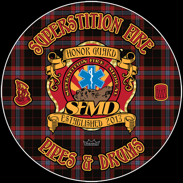 The most recent post shows matching black outlines on the pipes and drum, and the tartan has been centered. Here's your design with finishing effects, along with some closeups. We brought the banners and "SFMD" to a similar color as the background gold maltese, and gave it all a slightly weathered metallic look. Also added gold trim around the red ring at the center of the maltese. "Honor Guard" is carved into the banners, the center blue insignia is now slightly embossed, and the brownstone looks more like stone. The outer pipes and drum have a similar gold treatment. The outside type has a smooth metal look to maintain readability. Your originally submitted file is posted at the bottom. | ||